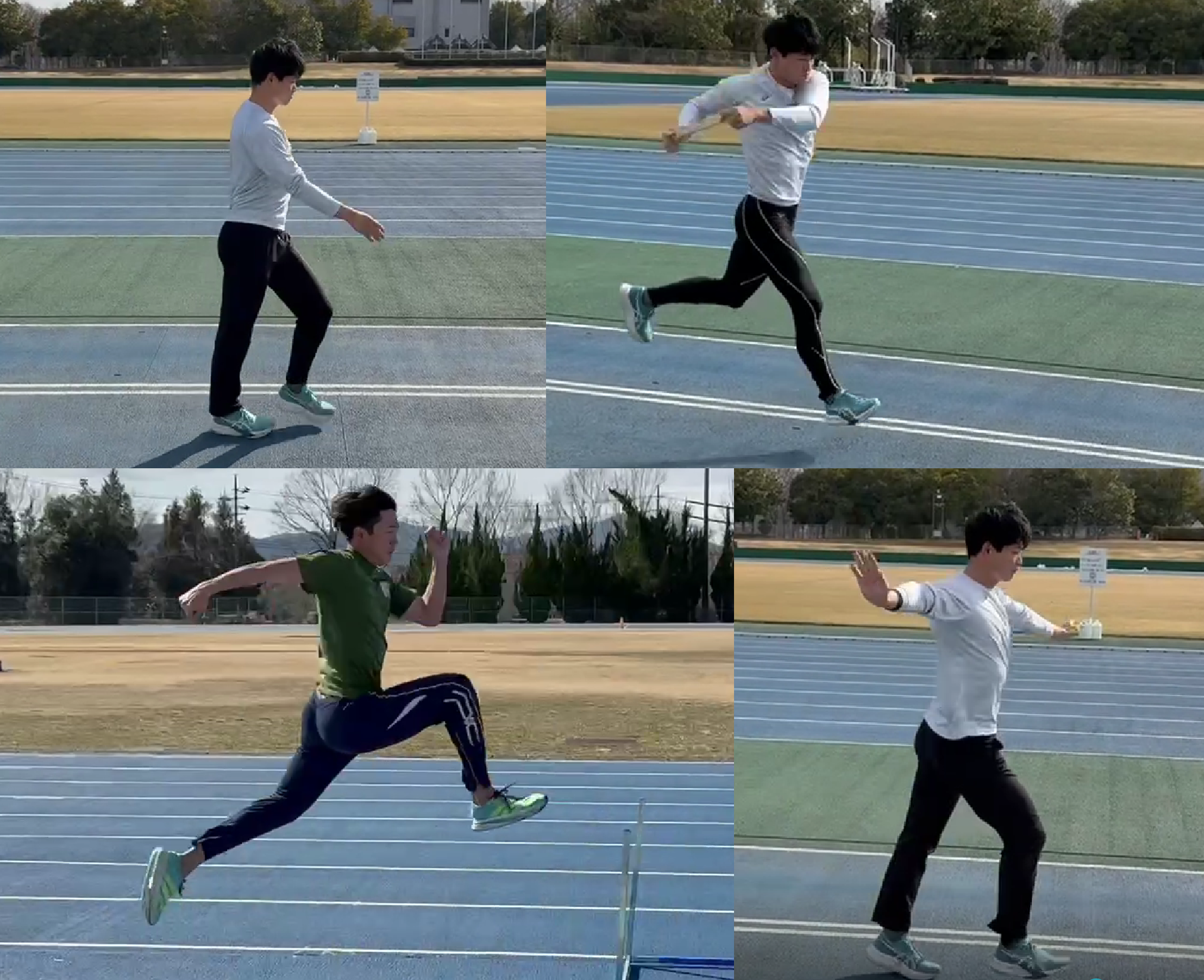 「タタンタタン!」のリズムで、次は前に膝蹴りをするように連続跳躍していきます。骨盤、股関節からグーンと前に抜ける踏み切りスキルを部分的に習得していきます。これも動画はハードルでやっていますが、何もないところでもできるよう、まずやり方を習得してください。