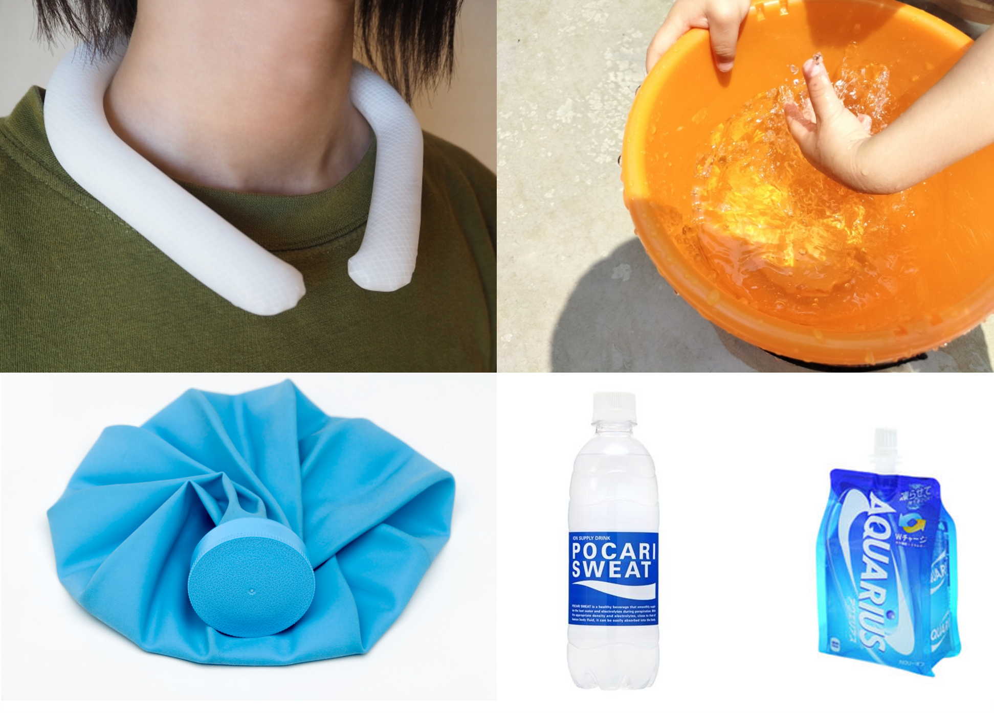 また、運動中の体温上昇を抑えるためには、以下のようなものを活用することができます。身体の外側から+内側からの冷却を組み合わせることが重要です。