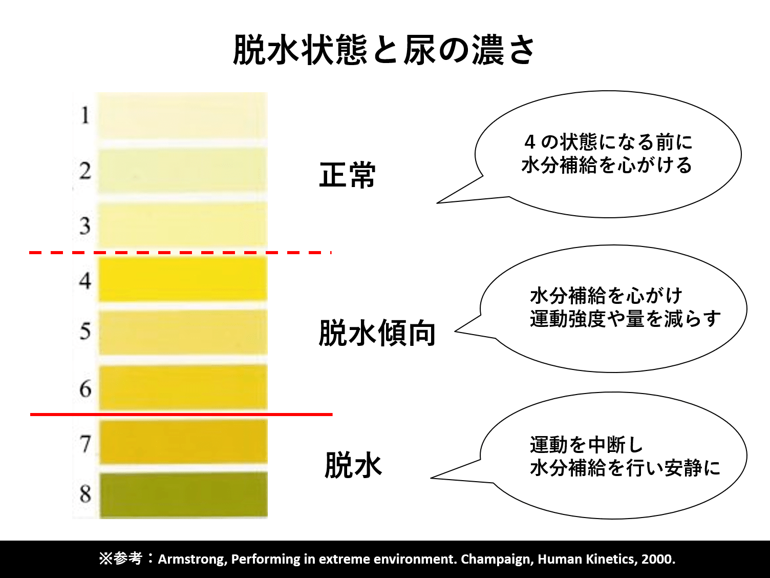 ※運動前の尿の色は、脱水の良い指標になります。水分補給の重要性を子供に学習させることは、熱中症防止のために有効な手段です。その材料として、上図を活用してみて下さい。