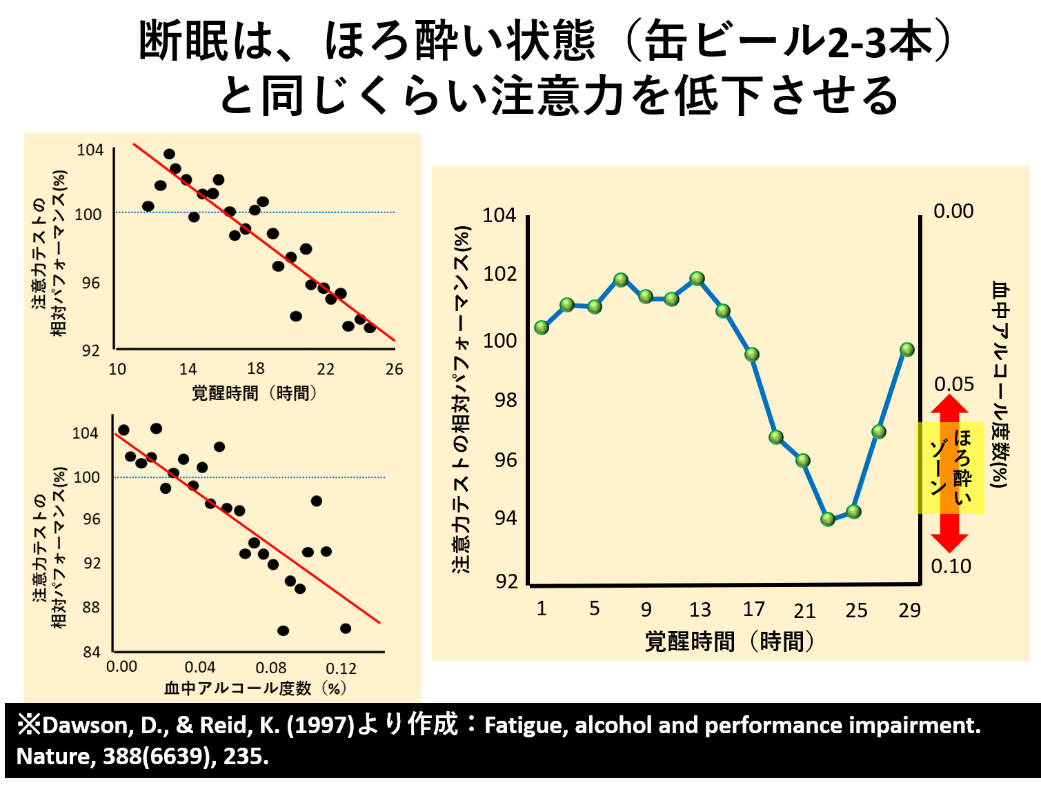 一晩の断眠は、血中アルコール濃度0.09%のほろ酔い状態と同レベル注意力の低下を引き起こす(Dawson and Reid, 1997)ことからも、ただの寝不足では済まされないレベルで注意力が下がることが分かります。