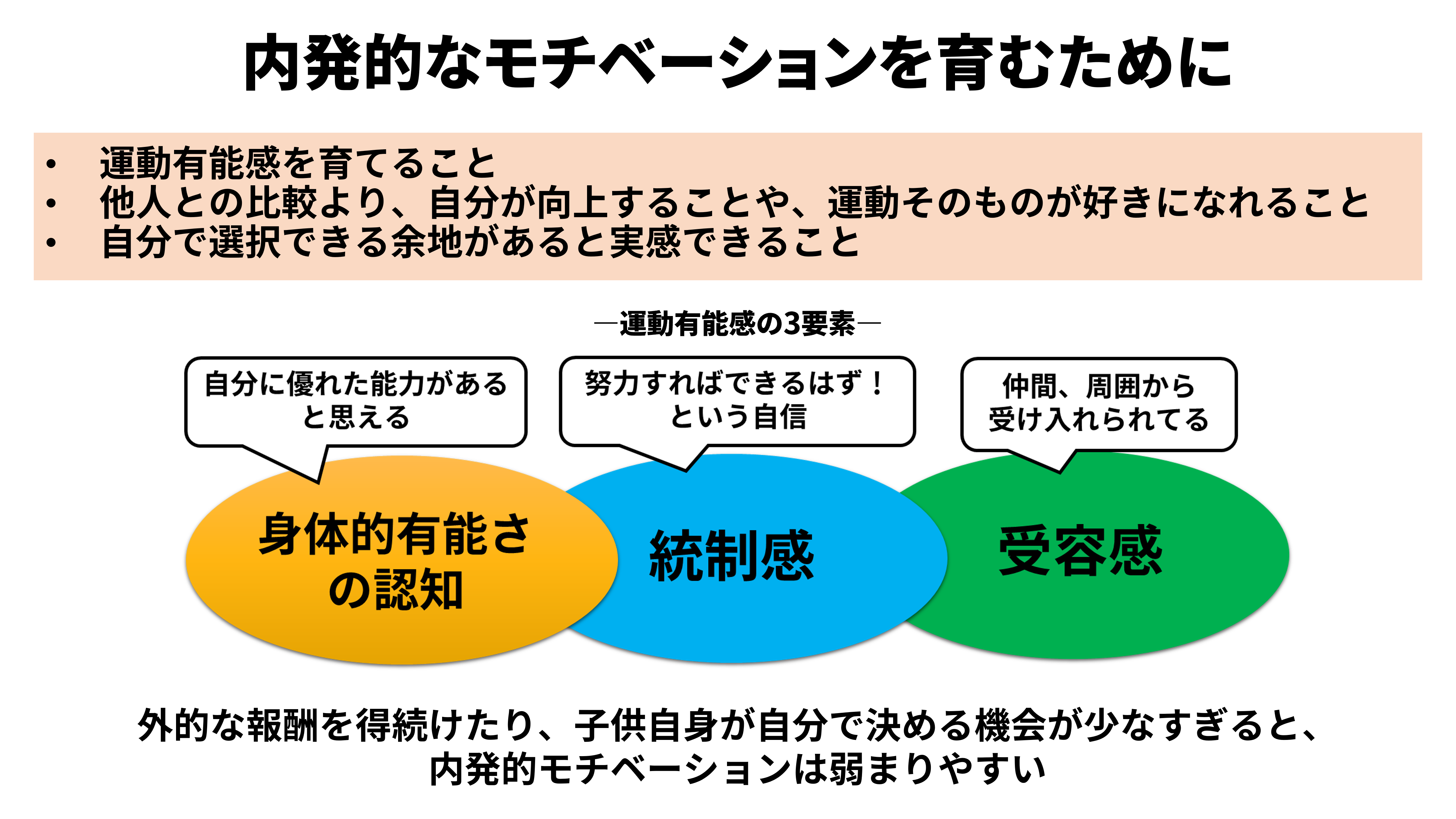 この内発的なモチベーションに関わる運動有能感の形成には、親やコーチ、周囲の子供らとの関わり方が強く影響します。